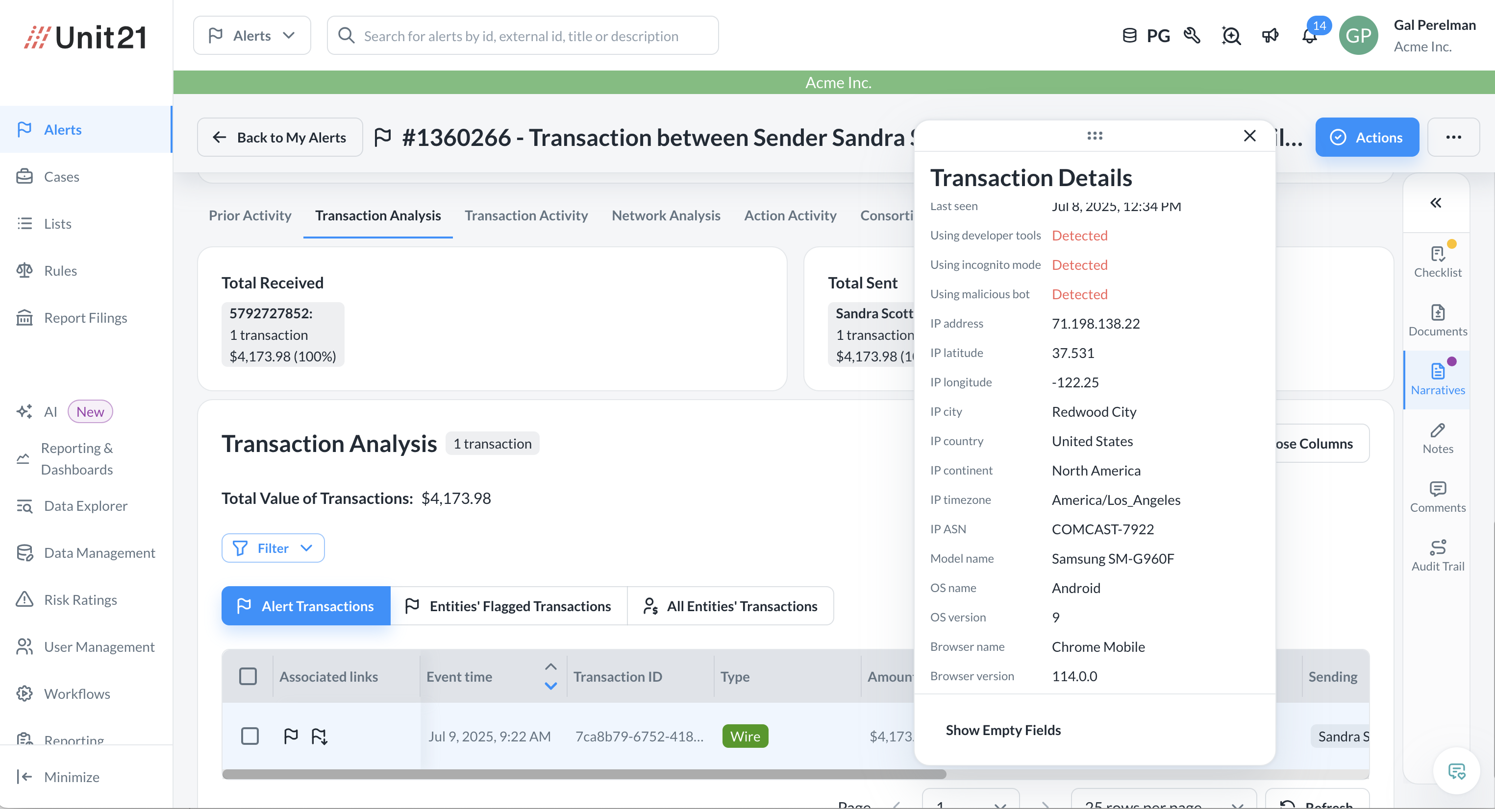 “With Unit21, an alert becomes a case and a filing in one seamless flow—what used to take days now takes minutes.”