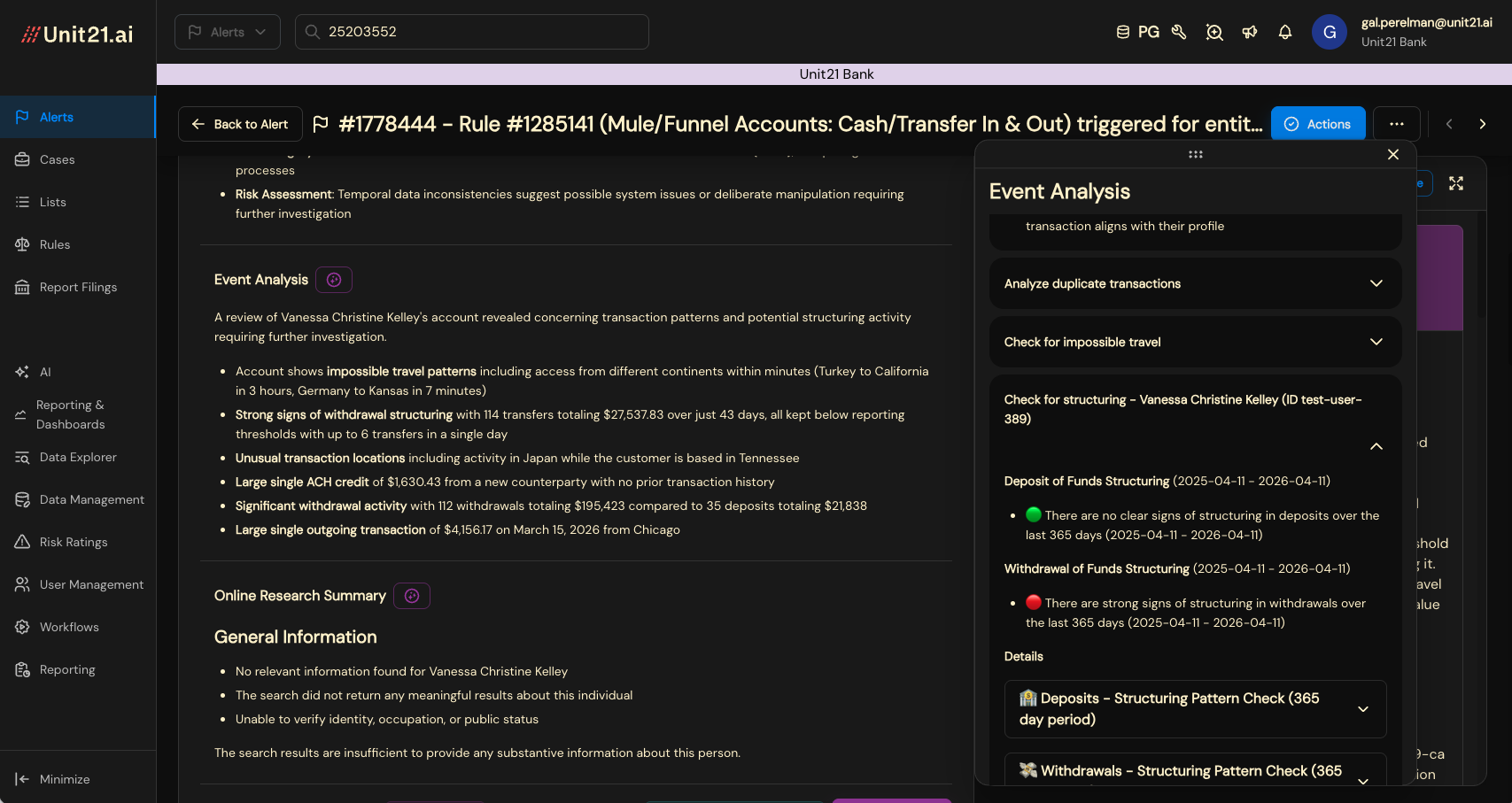 Structuring Activity Analysis closes that gap. It doesn't flag a potential issue and hand it to an analyst to investigate; it conducts the investigation and then presents the output ready for review. The analyst's job is to evaluate the findings and make the call, not to assemble the case.
