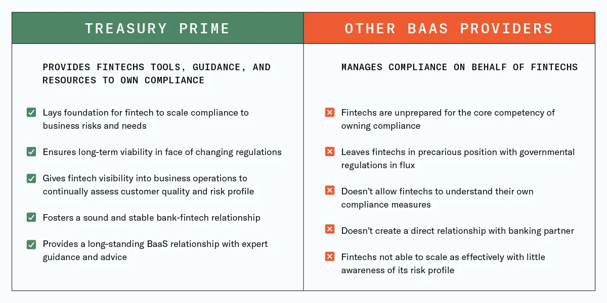 Treasury Prime is different than other BaaS companies because we help our clients stand up their own compliance program that is tailored to their specific risk profile, helping them to stand up to increased regulatory scrutiny.