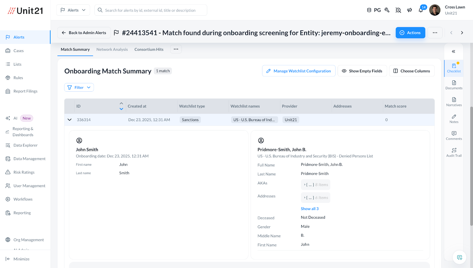 Unit21’s Watchlist Screening Suite was built to solve the exact challenges outlined above. Rather than offering yet another point solution or bolt-on module, it delivers a unified, flexible, and transparent approach to screening across the full customer lifecycle.