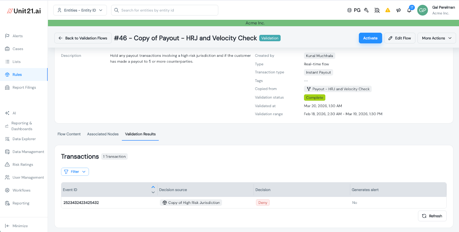 Validate before you go live. Flows include a Validation Mode that runs your Flow against historical event data before activation. You can see exactly how real past traffic would have been decisioned, which events would have been allowed, denied, or stepped up, and tune accordingly. When you're confident, activate.