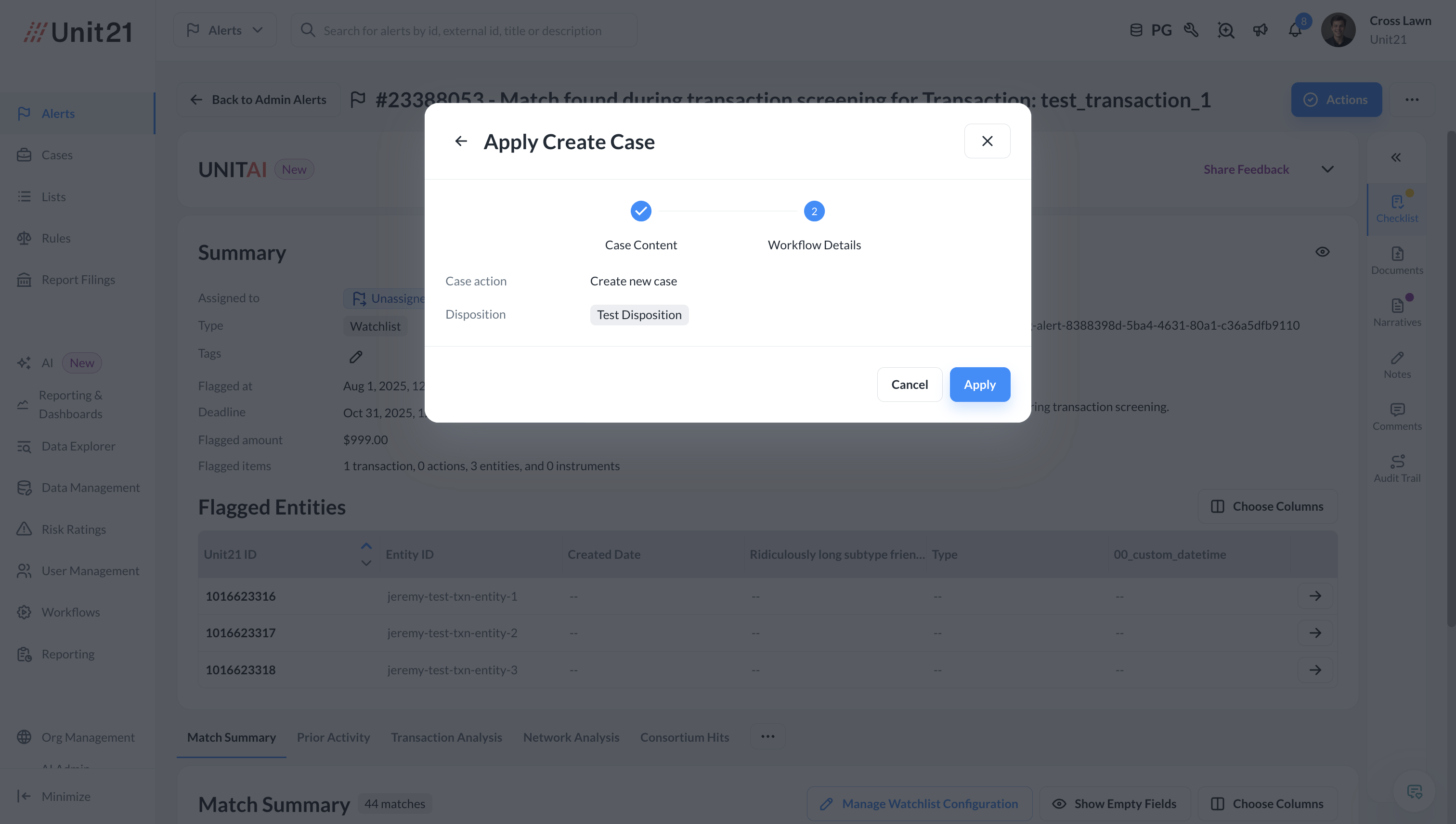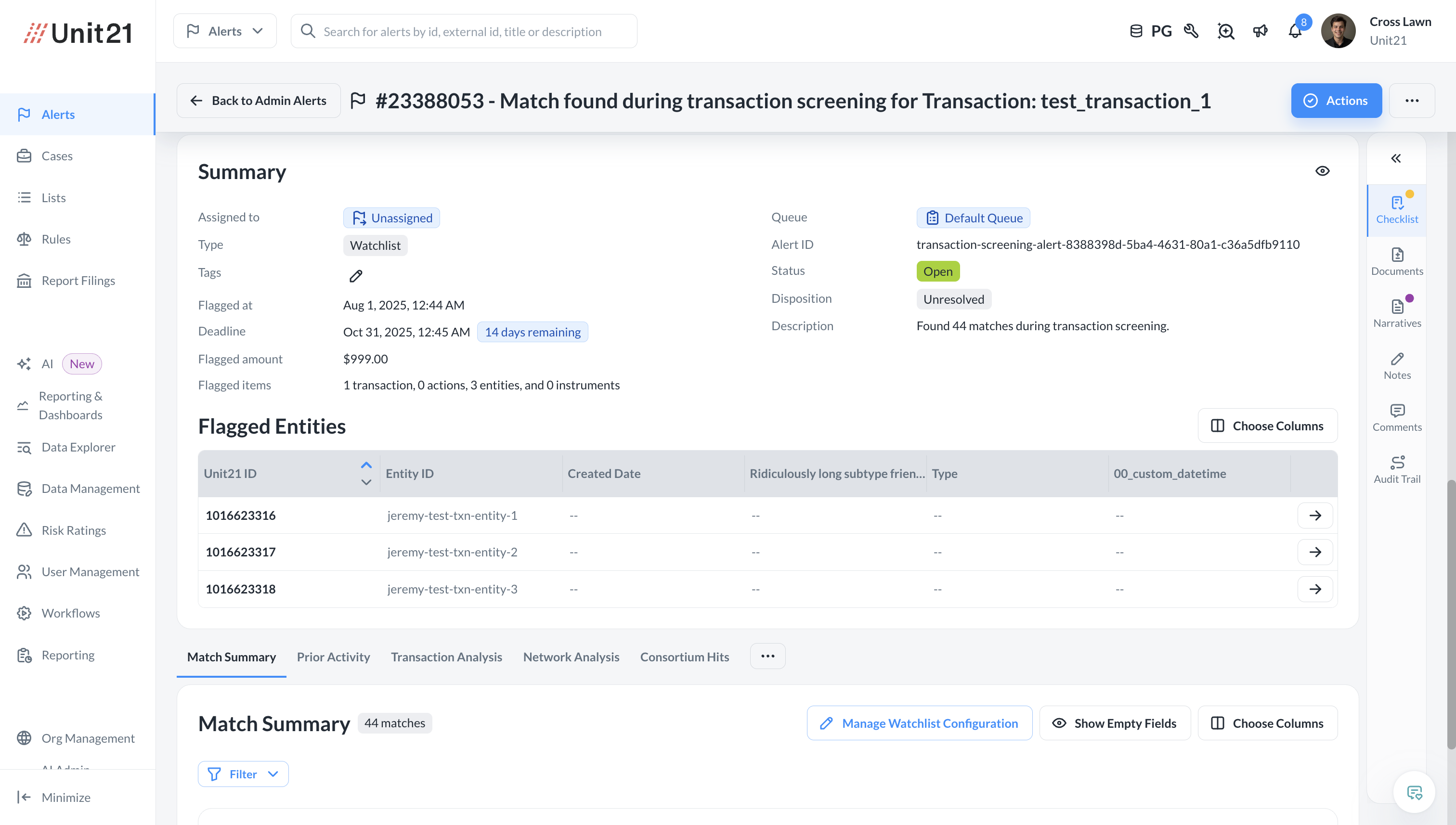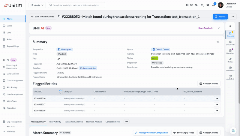 Automatically generate risk scores and alerts in Unit21 — complete with transaction details, flagged entities, and a customizable match summary.